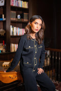 This sophisticated, tailored blazer features gold chain trim detailing along the chest pockets and front placket. The classic silhouette is elevated with gold button closures and a refined round neckline, creating a timeless and elegant look.
