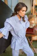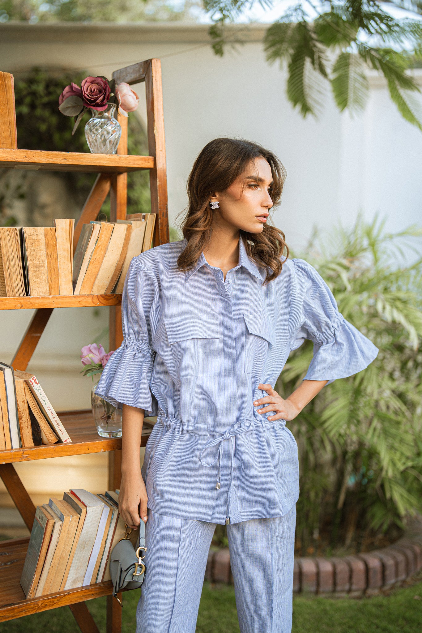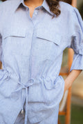 This chic striped shirt dress features a classic collared neckline with button-front closure and functional chest pockets. The relaxed silhouette is cinched at the waist with a matching fabric tie belt, creating a flattering and effortless look.