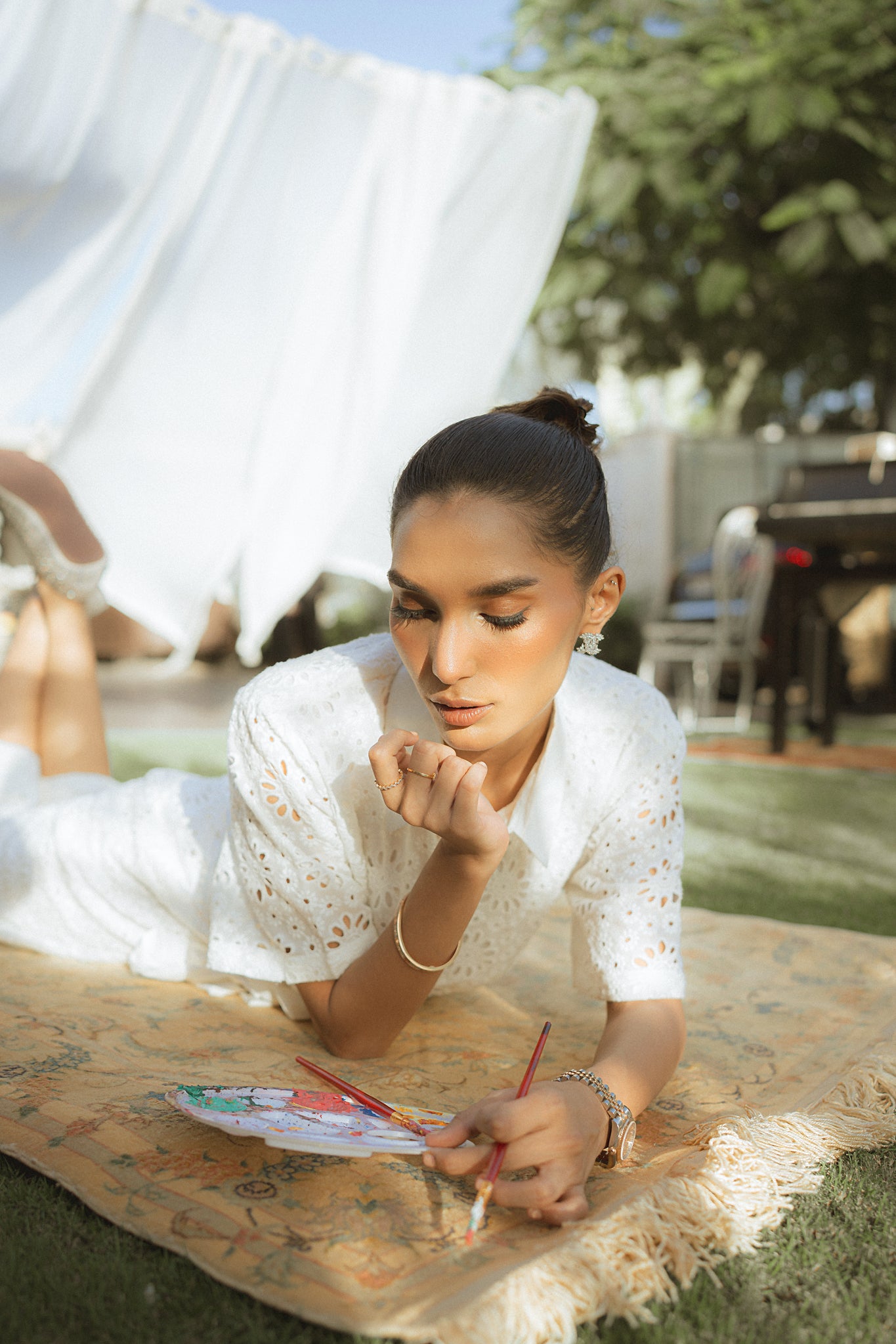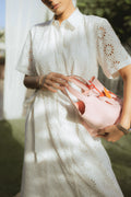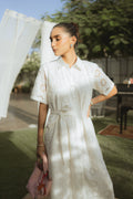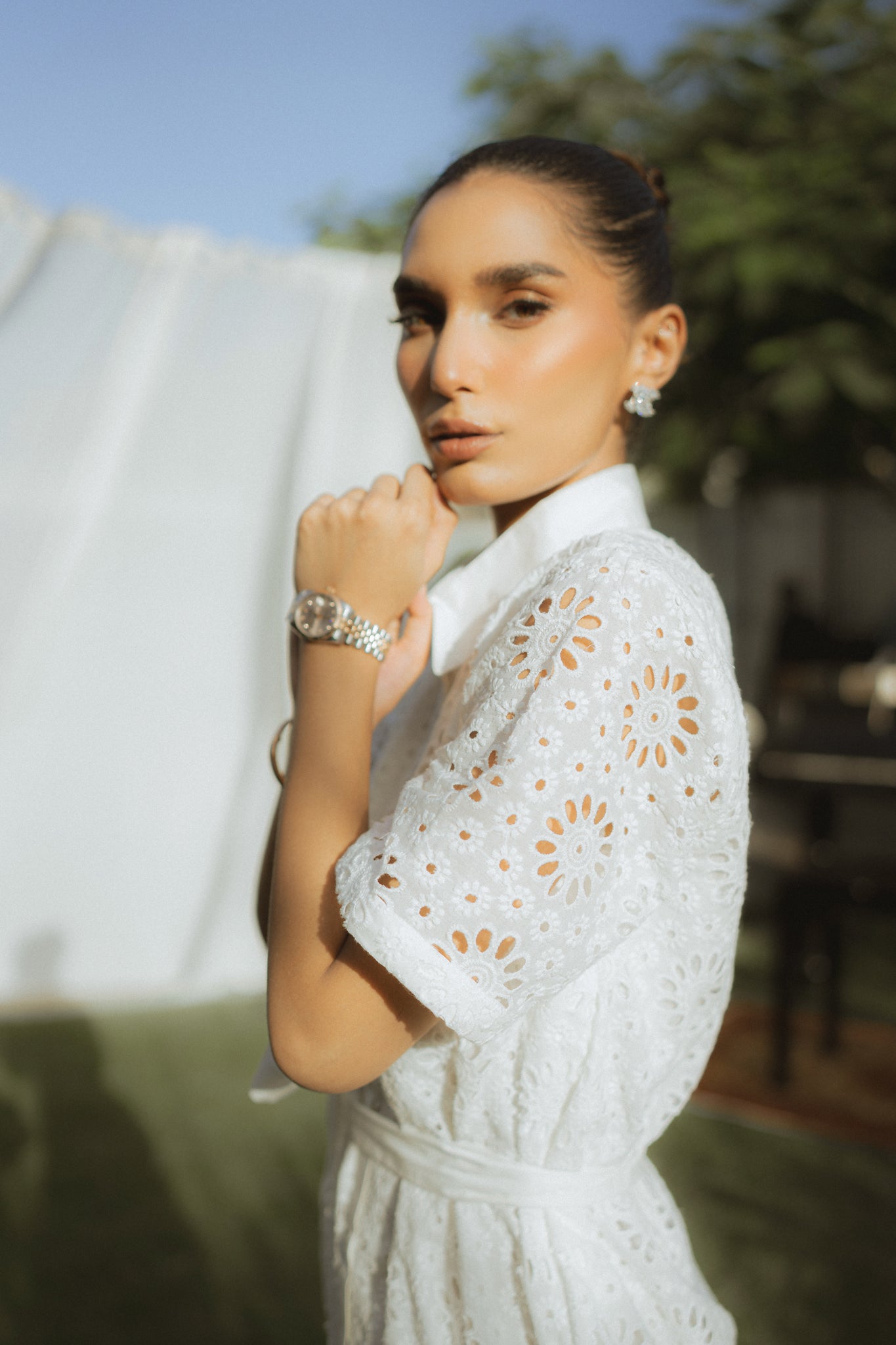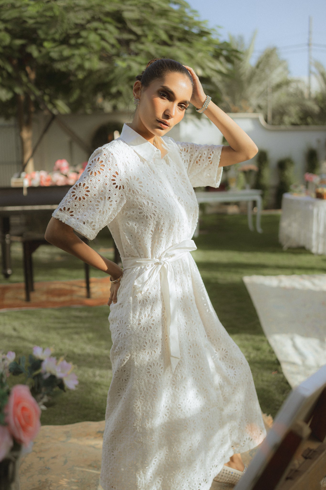 This elegant eyelet dress features a collared neckline with a tie detail and short puffed sleeves. The relaxed A-line silhouette showcases intricate floral cutwork embroidery throughout, creating a breezy and sophisticated look.