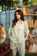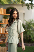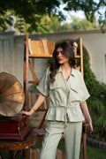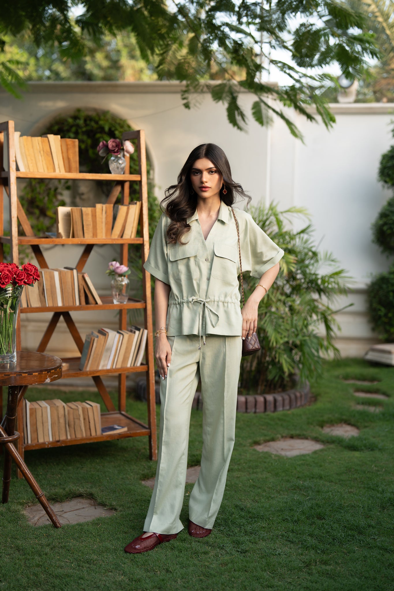 This sophisticated utility-style ensemble features a collared shirt with chest flap pockets and button-front closure. The relaxed short sleeves and adjustable drawstring waist create a modern silhouette, paired with matching tapered trousers for a polished, coordinated look.